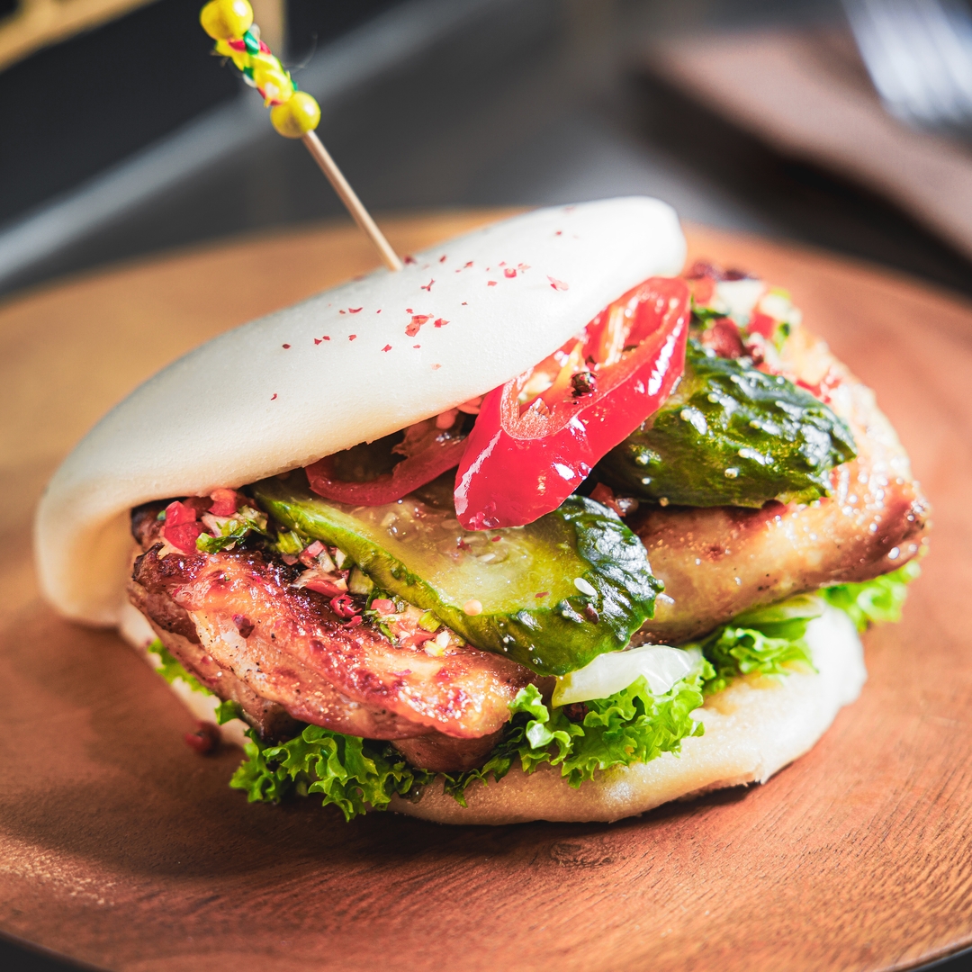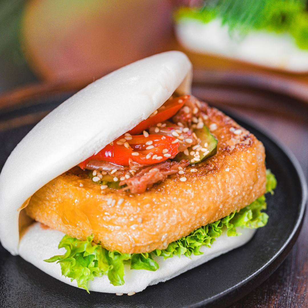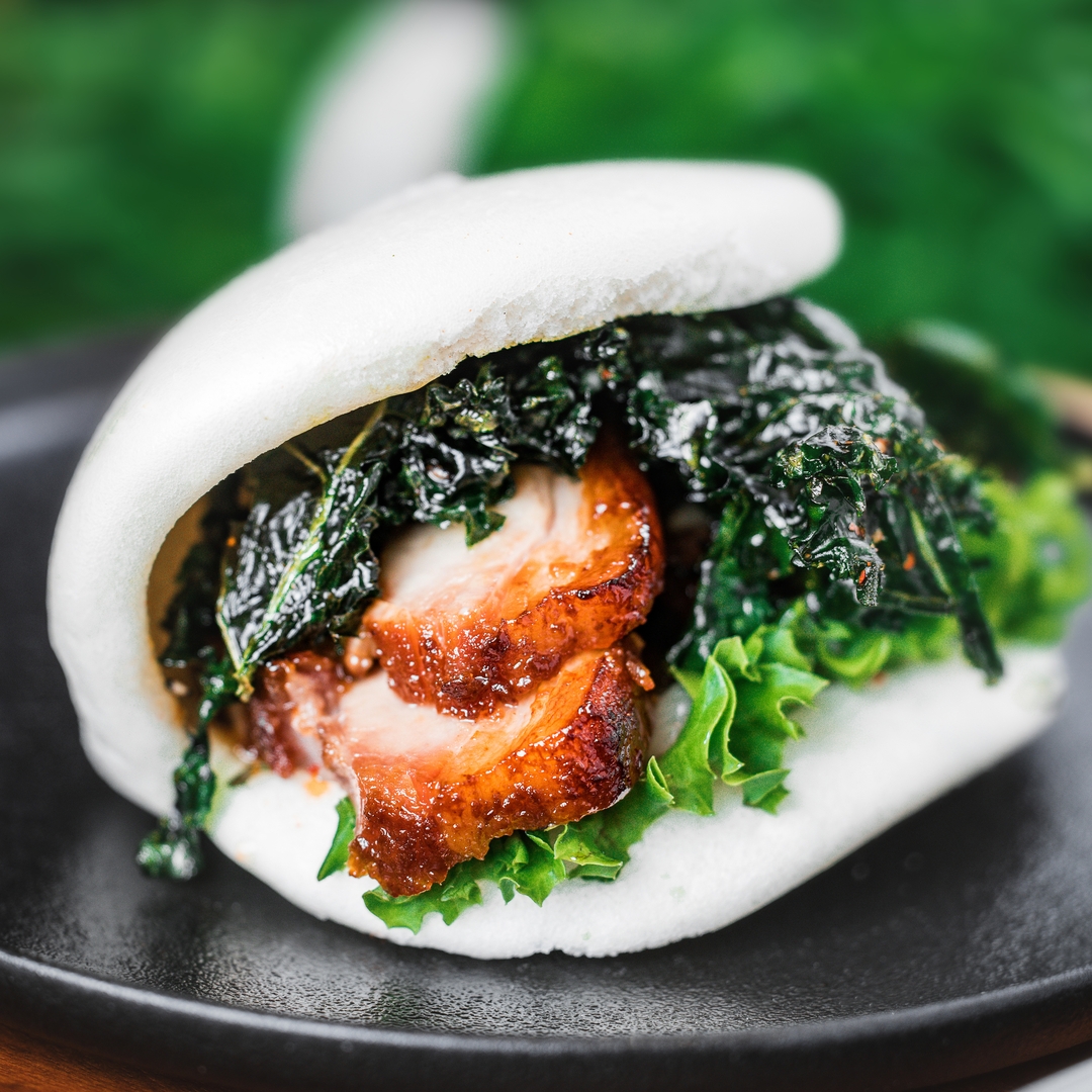 Bao bun, a popular Taiwanese street food, is paired with the star of Cantonese barbecue. Stuffed with slices of saucy roast chicken, the steamed flatbread is garnished with fresh coriander and ground peanuts to make a wholesome and tasty snack.e rice.