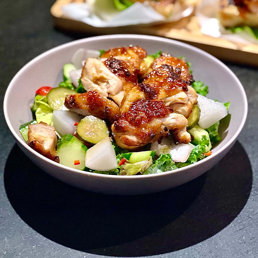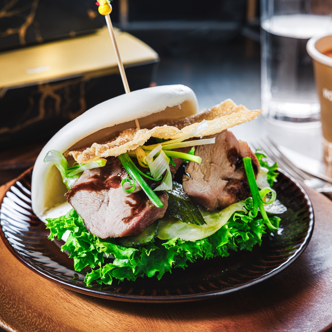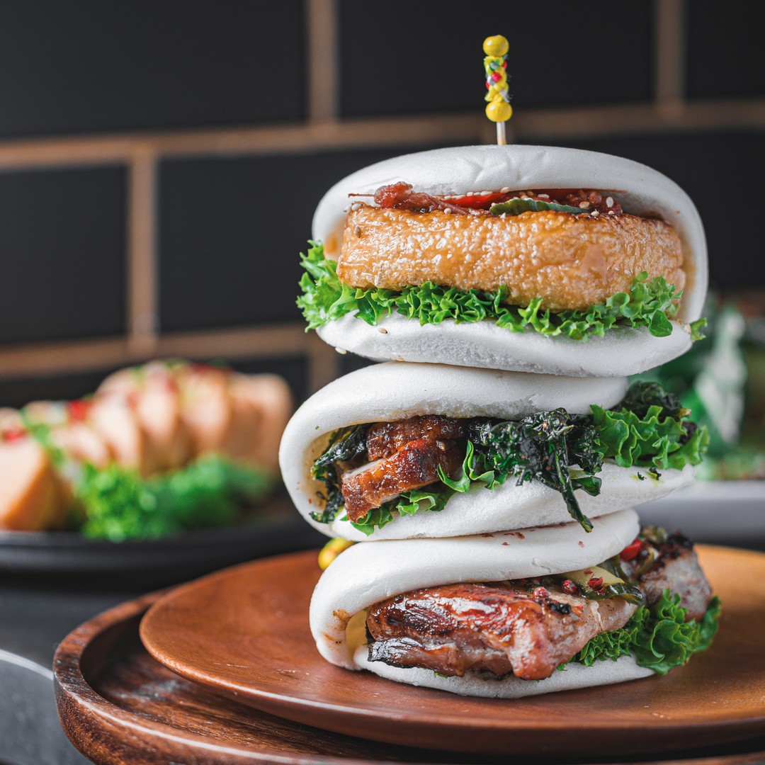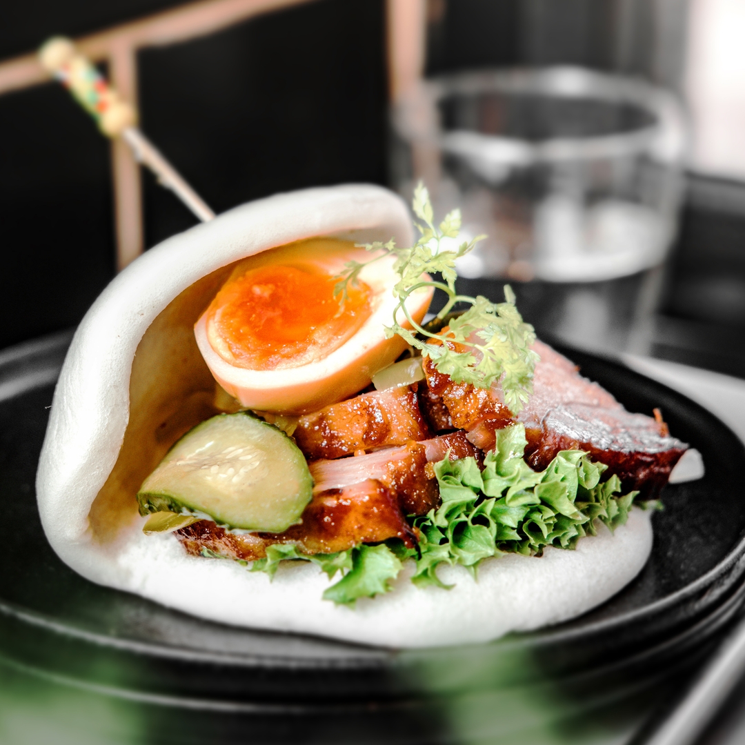 Bao bun, a popular Taiwanese street food, is paired with the star of Cantonese barbecue. Stuffed with slices of saucy roast chicken, the steamed flatbread is garnished with fresh coriander and ground peanuts to make a wholesome and tasty snack.e rice.